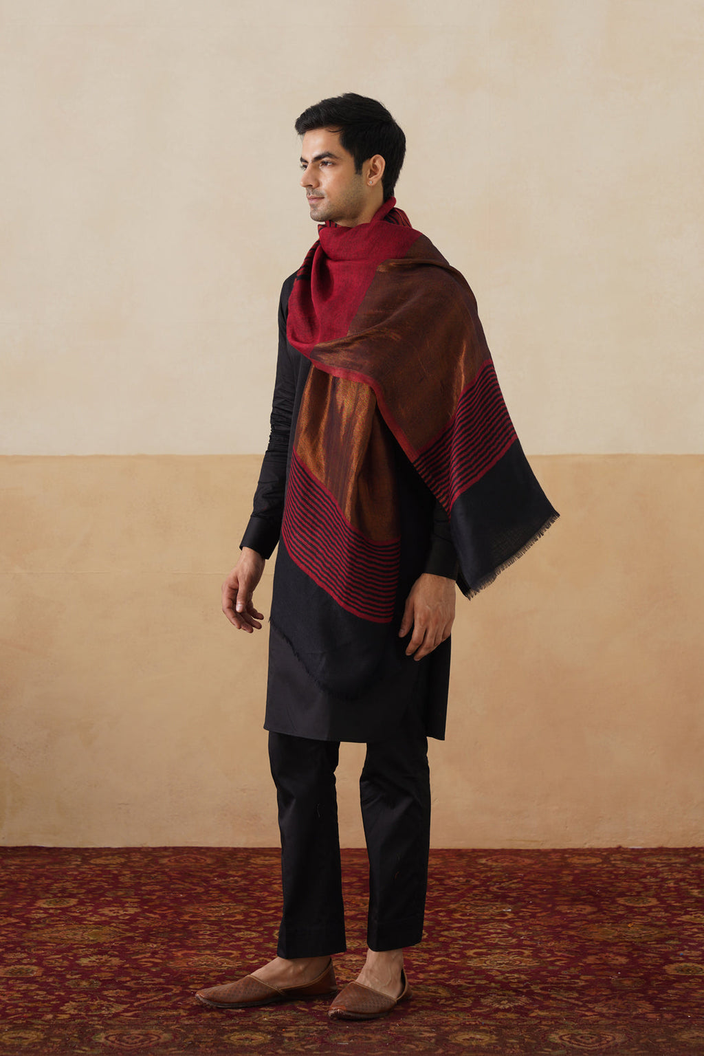 Reversible zari stripe stole in deep red and black— with a rich copper sheen, matte and minimal stripes. Soft, fluid drape for festive nights, weddings, and dressy winter layers. The lightweight design ensures style without compromising on comfort.