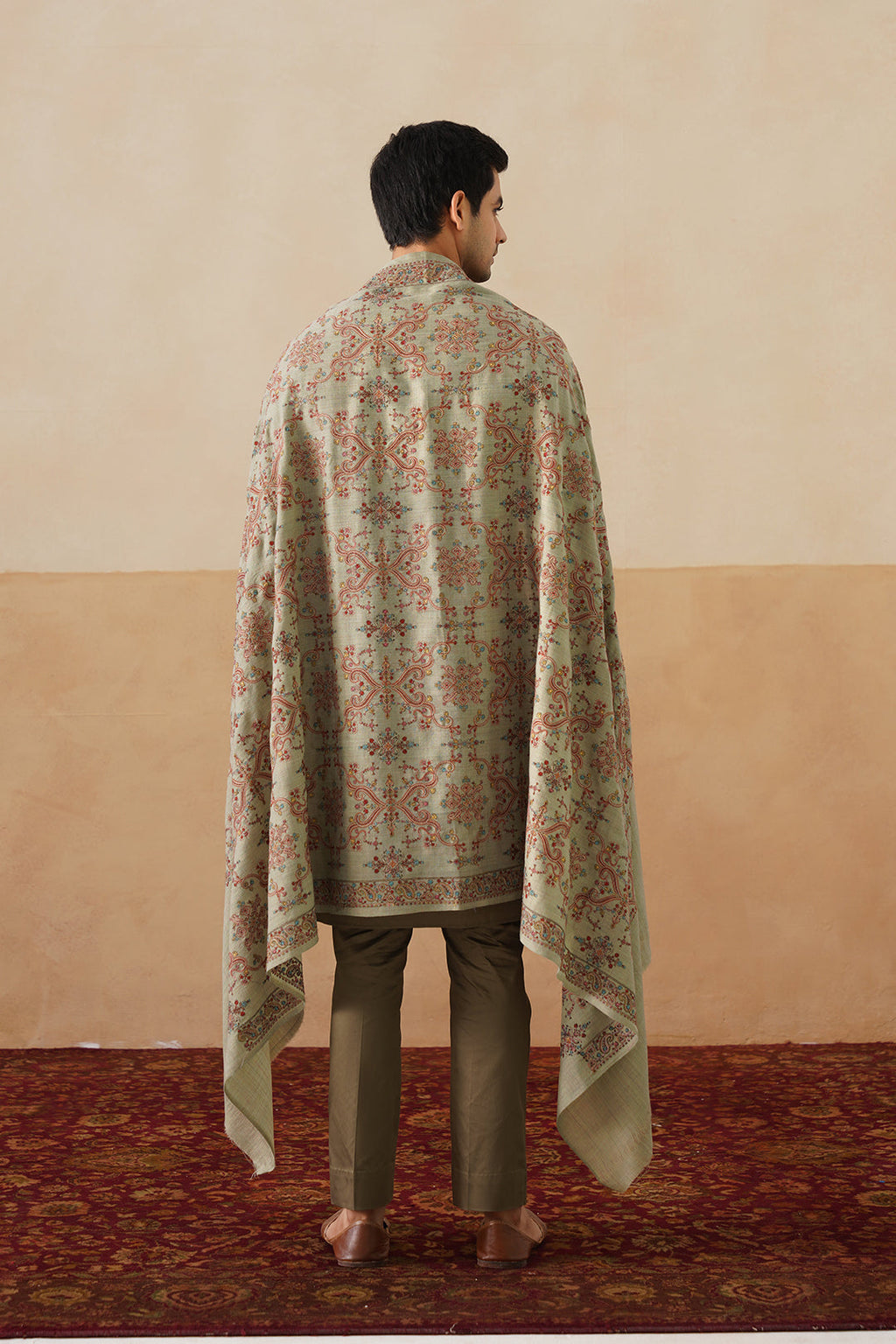 A mint-green embroidered shawl with delicate vine motifs—lightweight, soft, and effortless to style. Made to elevate festive looks, day weddings, and everything in between. This men's shawl style is crafted from premium fabric, providing warmth and a luxurious feel.