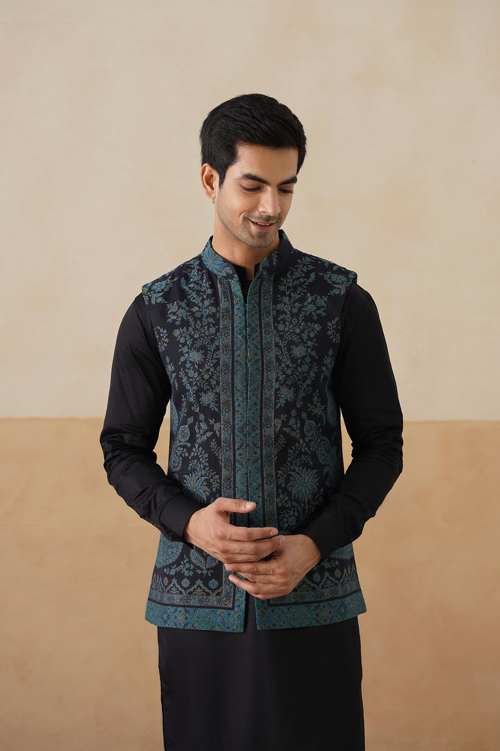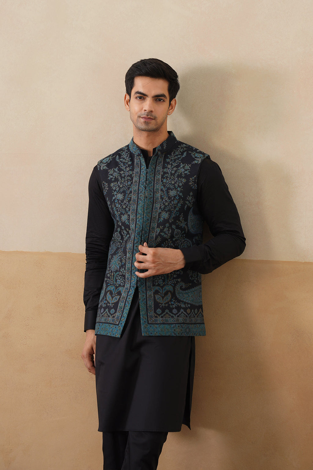 Embrace timeless elegance with our Midnight Kaani Jacquard Nehru Jacket, complete with a matching kurta and pant. This sophisticated black Nehru jacket is designed for men who appreciate the perfect balance of tradition and modern style. The luxurious Kaani Jacquard fabric adds depth and texture to the classic Nehru jacket, making it a standout piece for both formal and festive occasions.