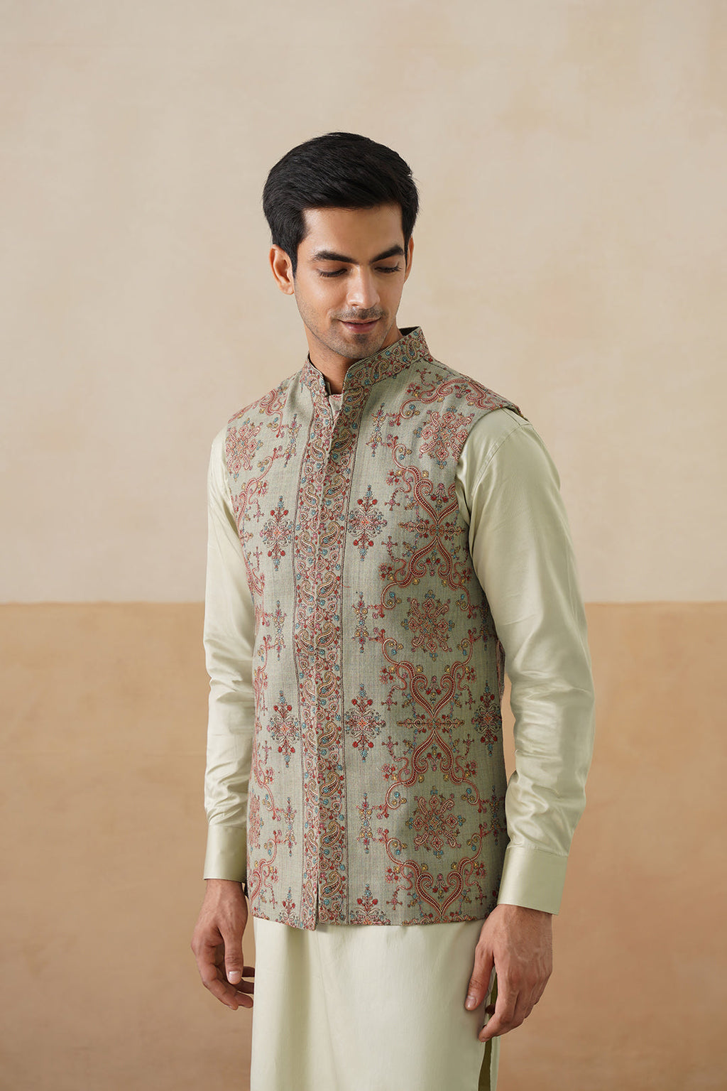 Step into sophistication with our Olive Embroidered Paisley Nehru Jacket, perfectly paired with a matching kurta and pant. This exquisite embroidered Nehru jacket is crafted for men who value both tradition and contemporary flair. The intricate paisley design in rich olive adds a touch of luxury to the classic Nehru jacket, making it a versatile choice for both formal events and festive gatherings.